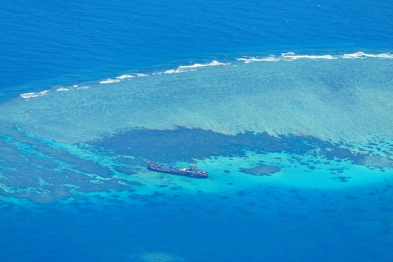 Its claims include the waters around Scarborough Shoal (Huangyan Island, 黃岩島) — which Beijing seized from Manila in 2012 — where the Chinese People’s Liberation Army’s Southern Theater Command yesterday said it held air and sea patrols.