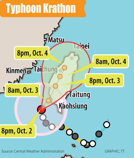 Typhoon Krathon was expected to land in southwest Taiwan proper early today, hitting Chiayi County, Tainan and Kaohsiung, but could weaken to a tropical storm, the Central Weather Administration (CWA) said yesterday.