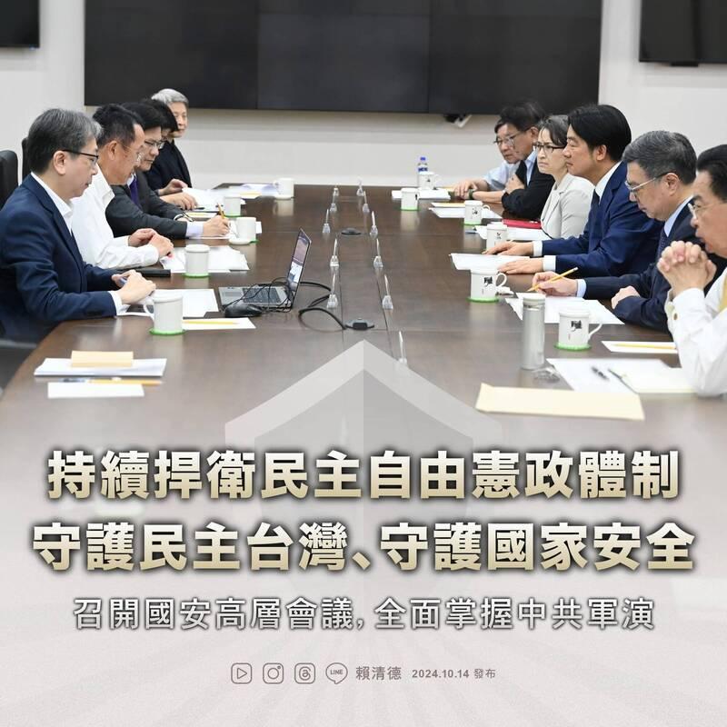 President William Lai (賴清德) convened a high-level national security meeting today instructing the armed forces and other government agencies to handle military drills China announced it had launched around Taiwan from this morning.