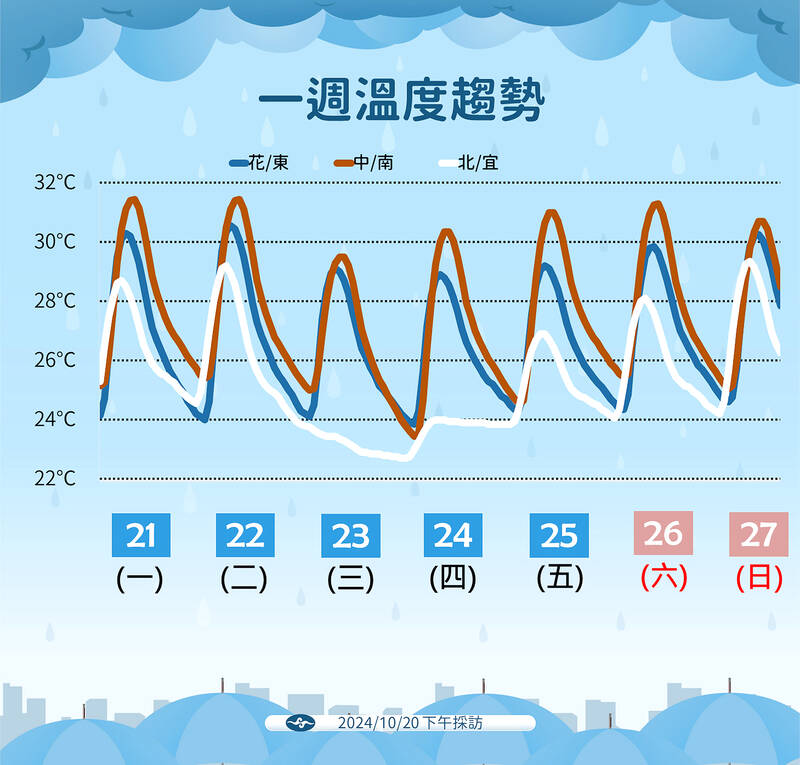 However, as northeasterly winds strengthen tomorrow night, temperatures in the north and northeast would drop to 24°C to 25°C degrees on Wednesday, and would remain cool with occasional showers through Saturday, the CWA said.