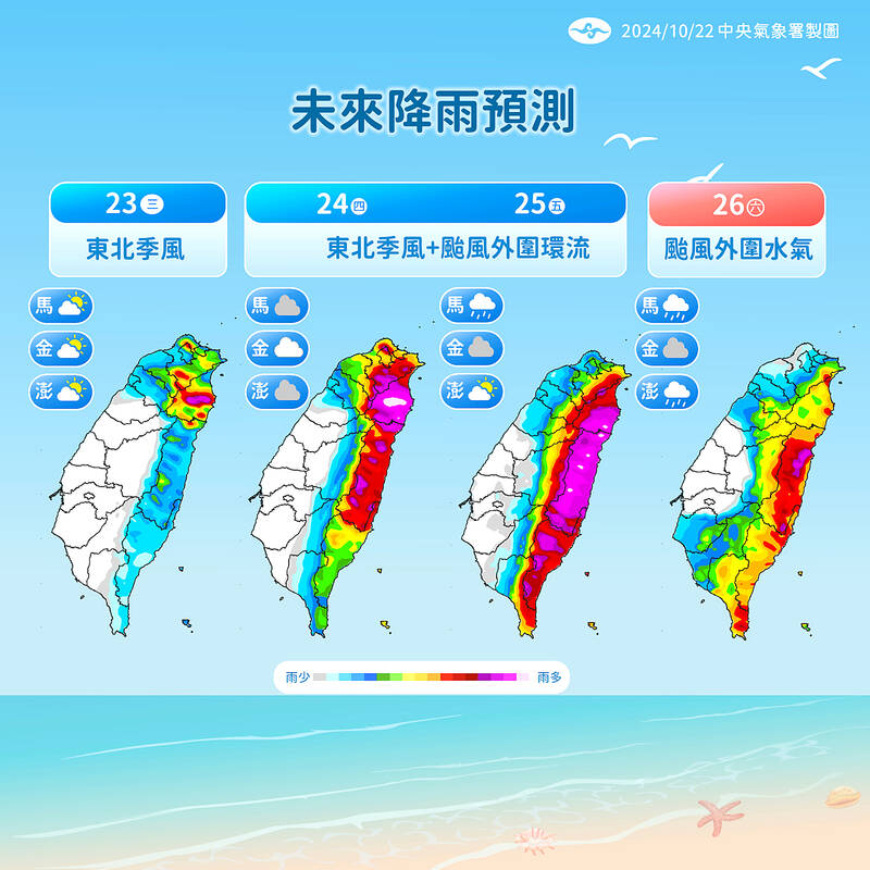 The agency is highly unlikely to issue land or sea warnings for the storm, but Trami’s radius is expected to grow to 280km this afternoon, increasing the risk of torrential rain and related effects in northern Taiwan as well as Yilan and Hualien counties over the following two days, CWA forecaster Huang En-hung (黃恩鴻) said.
