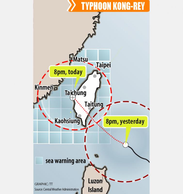 Typhoon Kong-rey is expected to make landfall on Taiwan’s east coast today, with work and classes canceled nationwide.
