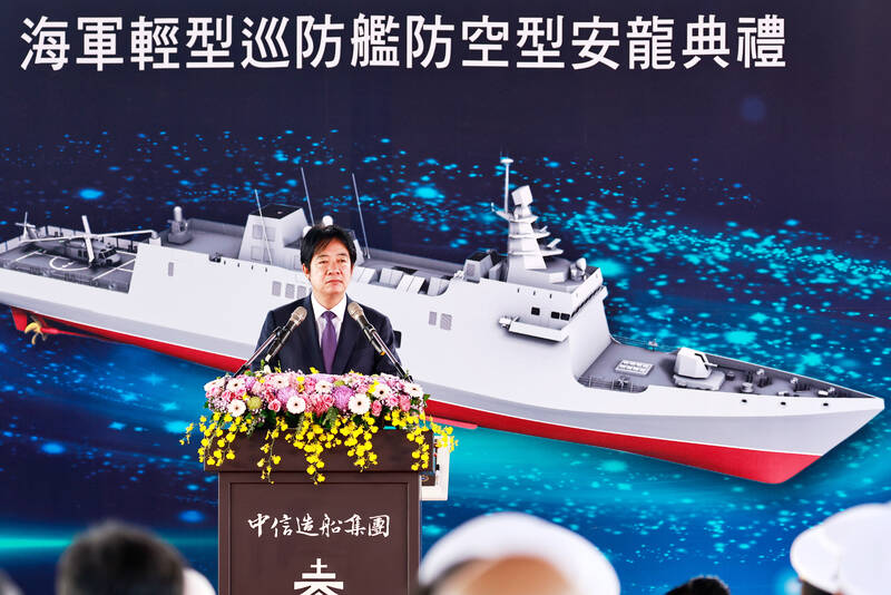 President William Lai (賴清德) praised the progress made in Taiwan’s ongoing domestic shipbuilding project, while presiding over a keel-laying ceremony for a domestically built light frigate prototype in Kaohsiung yesterday.