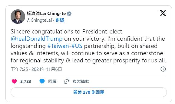 President William Lai (賴清德) congratulated Trump on social media last night.