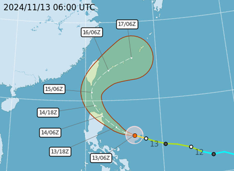 Usagi could bring scattered or isolated rain showers to much of Taiwan, particularly in the eastern counties of Hualien and Taitung and on the Hengchun Peninsula (恆春半島) in the south, when it is closest to Taiwan from tomorrow to the early hours of Sunday, it said.