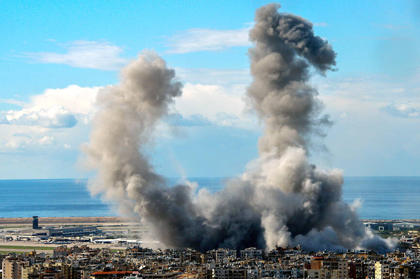 Israeli jets yesterday struck at least six buildings in Beirut’s southern suburbs. One strike slammed near the country’s only airport, sending large plumes of smoke into the sky. There were no immediate reports of casualties. Other strikes hit in the southern city of Tyre, where the Israeli military said it killed a local Hezbollah commander.