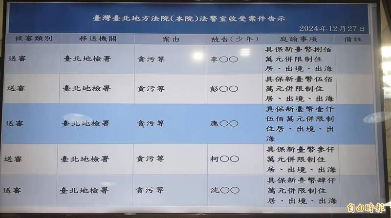 Pong can be released on bail of NT$5 million and Ying on bail of NT$15 million. Lee can be released on bail of NT$10 million and Sheen on bail of NT$40 million, the court said.