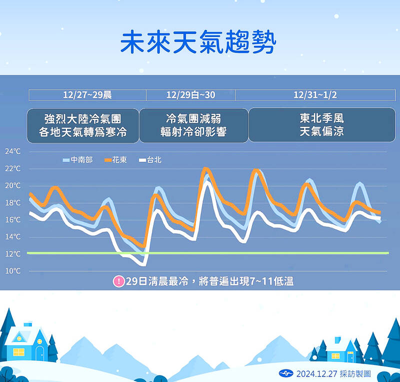 Parts of the nation, including in the south, could experience temperatures as low as 7°C early tomorrow morning, the Central Weather Administration (CWA) said yesterday.
