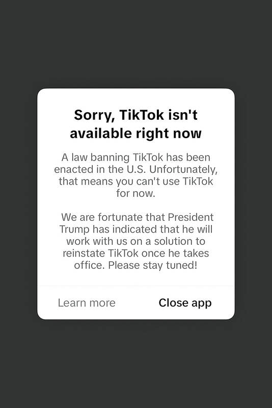 TikTok, removed from prominent app stores hours before the ban, said in a message to users attempting to log on that a “law banning TikTok has been enacted in the US.”