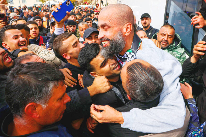 Freed Palestinian inmates were greeted by a cheering crowd in the occupied West Bank city of Ramallah yesterday, after Hamas released three Israeli hostages from the Gaza Strip in the fourth exchange under the group’s ceasefire deal with Israel.