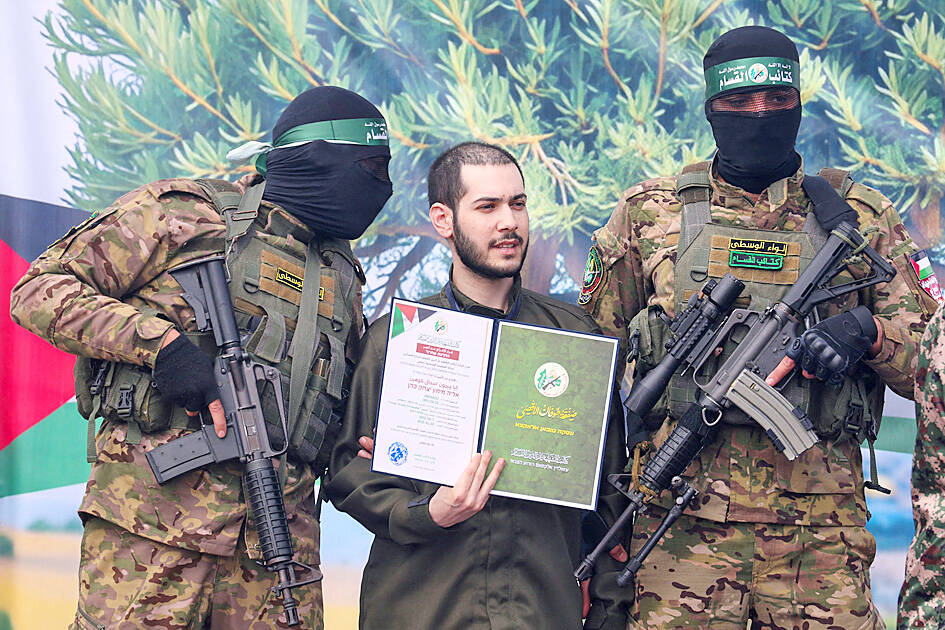 At a ceremony in Nuseirat, central Gaza, masked Hamas militants brought onto a stage Eliya Cohen, 27, Omer Shem Tov, 22, and Israeli-Argentine Omer Wenkert, 23.