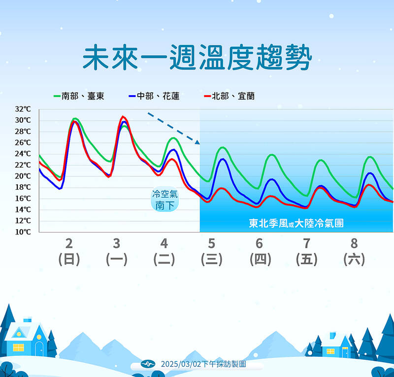 The lowest temperatures are expected on Wednesday and Thursday nights, when they could drop to 13°C to 14°C in northern and central Taiwan, and 14°C to 16°C in southern Taiwan, and Hualien and Taitung counties in the east, he said.