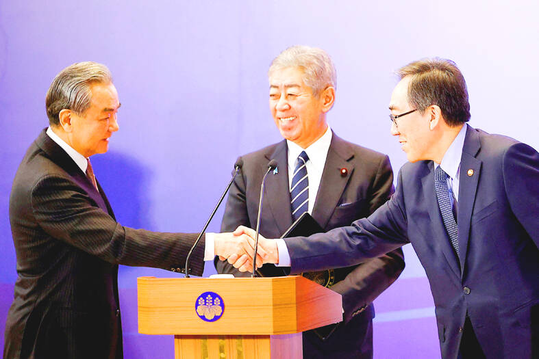 “Given the increasingly severe international situation, I believe we may truly be at a turning point in history,” Japanese Minister of Foreign Affairs Takeshi Iwaya said at the start of the meeting with Chinese Minister of Foreign Affairs Wang Yi (王毅) and South Korean Minister of Foreign Affairs Cho Tae-yul.