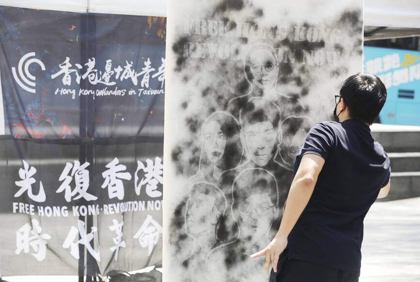 Artists at the protest spray-painted imagery of the “Hong Kong 47” democracy campaigners charged with conspiracy to commit subversion under Hong Kong’s National Security Law. Forty-five of them have been jailed. They also created images of Apple Daily founder Jimmy Lai (黎智英), who was accused of colluding with foreign forces, and Chow Hang-tung (鄒幸彤), who was imprisoned for commemorating victims of the 1989 Tiananmen Square Massacre.
