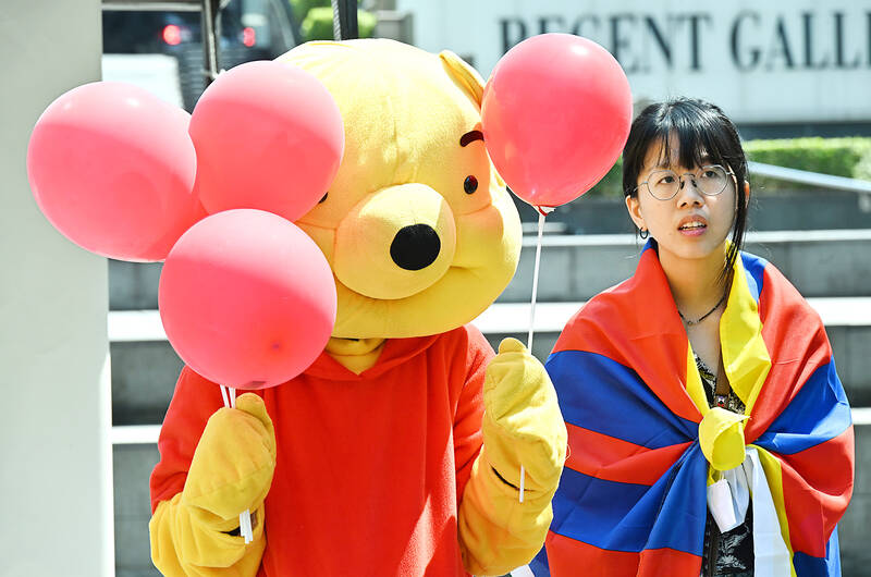 During a street theater performance, a person wearing a Winnie the Pooh costume — a reference to Chinese President Xi Jinping (習近平) — distributed red balloons filled with “sugar-coated lies,” which were “exposed” by Hong Kongers, Tibetans and Uighurs.