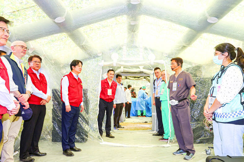 President William Lai (賴清德) yesterday oversaw the first civil defense drills under his newly created social resilience committee simulating how to respond to a large-scale disaster such as a tsunami or attacks on critical infrastructure.