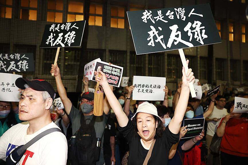 KMT supporters were protesting last night outside the Taipei District Prosecutors’ Office in Zhongzheng District (中正), a restricted area where public assembly is not allowed.
