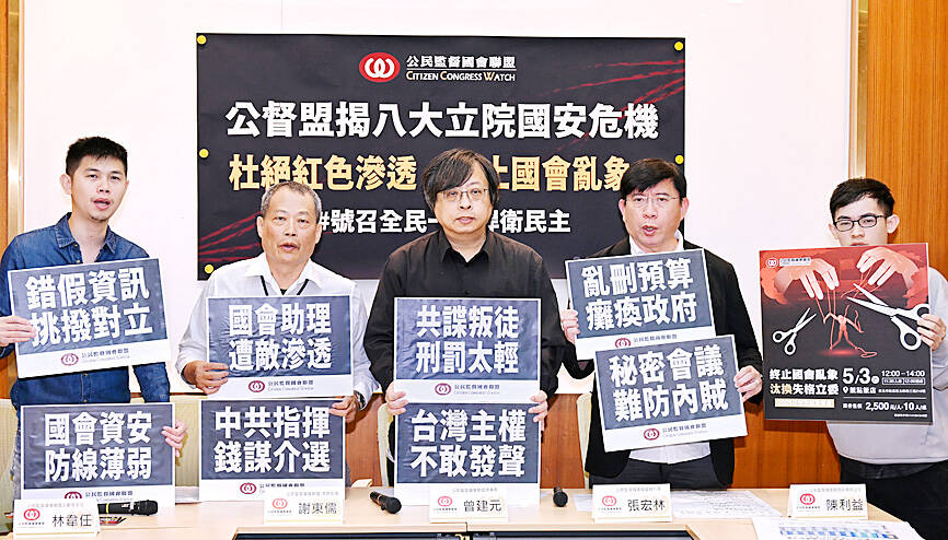 Taiwan is facing severe national security threats due to enemy infiltration and espionage activities inside the legislature, Chinese funding to meddle in elections and influence politicians, and lawmakers colluding to slash the government’s fiscal budget and blocking bills to enhance safeguards for Taiwanese sovereignty, Citizen Congress Watch (CCW) said yesterday.