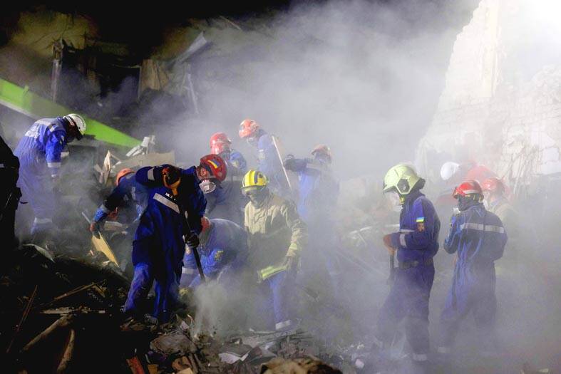 Rescue workers with flashlights scoured the charred rubble of partly collapsed homes as the blue lights of emergency vehicles lit up the dark city streets.