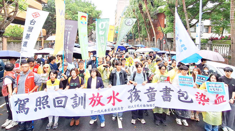 The rally was organized in response to a deadly car crash in New Taipei City’s Sansia District (三峽) on Monday last week when a 78-year-old driver, surnamed Yu (余), ran a red light at high speed before hitting pedestrians and scooter riders near an elementary school, leaving three people dead and 12 injured.