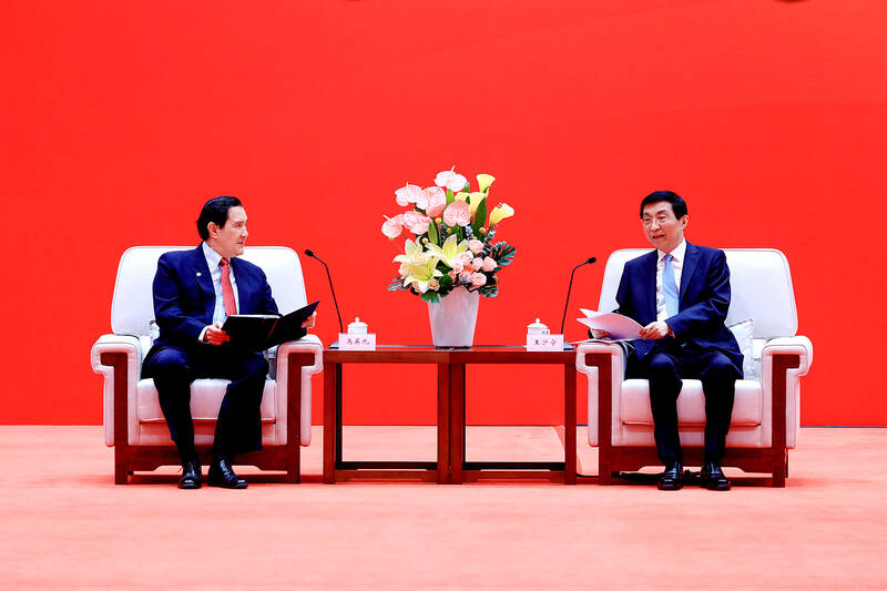 The 17th annual Straits Forum yesterday opened in Xiamen, China, and while the Chinese Nationalist Party’s (KMT) local government heads were absent for the first time in 17 years, Ma attended the forum as “former KMT chairperson” and met with Chinese People’s Political Consultative Conference Chairman Wang Huning (王滬寧).