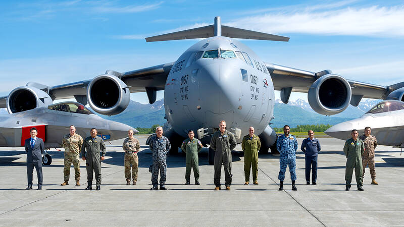 The caption of the image — which has since been removed from the US military’s Defense Visual Information Distribution Service — said that senior-ranking military observers from Taiwan, Japan, the Philippines, Malaysia, Thailand, Bangladesh, the UK and Canada on Friday last week gathered at Joint Base Elmendorf-Richardson to observe the Red Flag-Alaska 25-2 exercise.