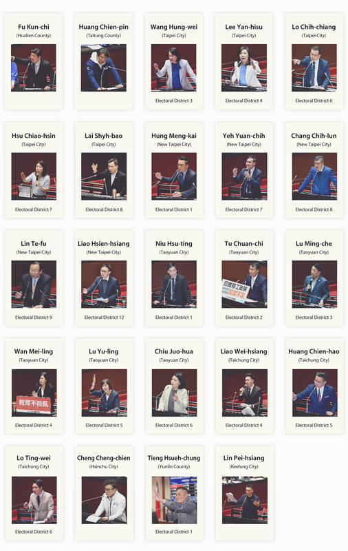 The 24 KMT lawmakers named in the recall motions announced yesterday are: Fu Kun-chi, Huang Chien-pin (黃建賓), Wang Hung-wei (王鴻薇), Lee Yan-hisu (李彥秀), Lo Chih-chiang (羅智強), Hsu Chiao-hsin (徐巧芯), Lai Shyh-bao (賴士葆), Hung Meng-kai (洪孟楷), Yeh Yuan-chih (葉元之), Chang Chih-lun (張智倫), Lin Te-fu (林德福), Liao Hsien-hsiang (廖先翔), Liao Wei-hsiang (廖偉翔), Niu Hsu-ting (牛煦庭), Tu Chuan-chi (涂權吉), Lu Ming-che (魯明哲), Wan Mei-ling (萬美玲), Lu Yu-ling (呂玉玲), Chiu Juo-hua (邱若華), Huang Chien-hao (黃健豪), Lo Ting-wei (羅廷瑋), Cheng Cheng-chien (鄭正鈐), Ting Hsueh-chung (丁學忠) and Lin Pei-hsiang (林沛祥).