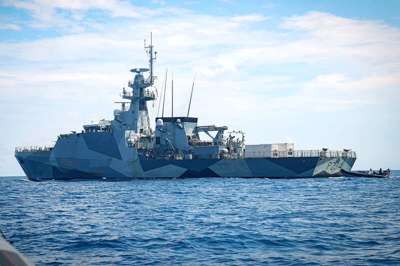 The Spey, a River-class offshore patrol vessel, on Wednesday last week sailed through the Taiwan Strait after participating in joint exercises in the East China Sea with Australia, Japan, South Korea and the US, the Royal Navy said at the time.