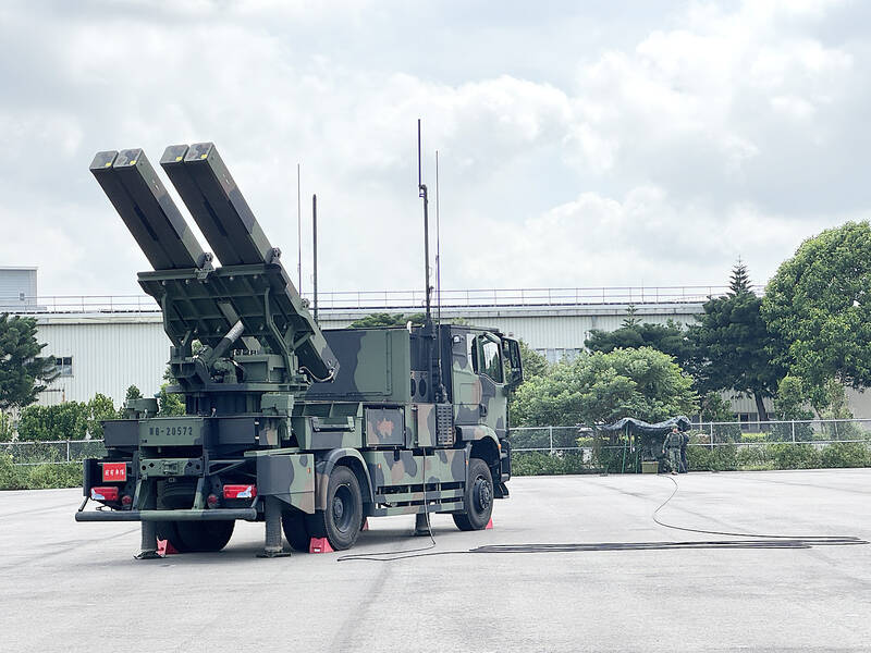 The army’s 21st Artillery Command conducted a short-range air defense drill in Taoyuan yesterday as part of the Han Kuang exercises, using the indigenous Sky Sword II (陸射劍二) missile system for the first time in the exercises.