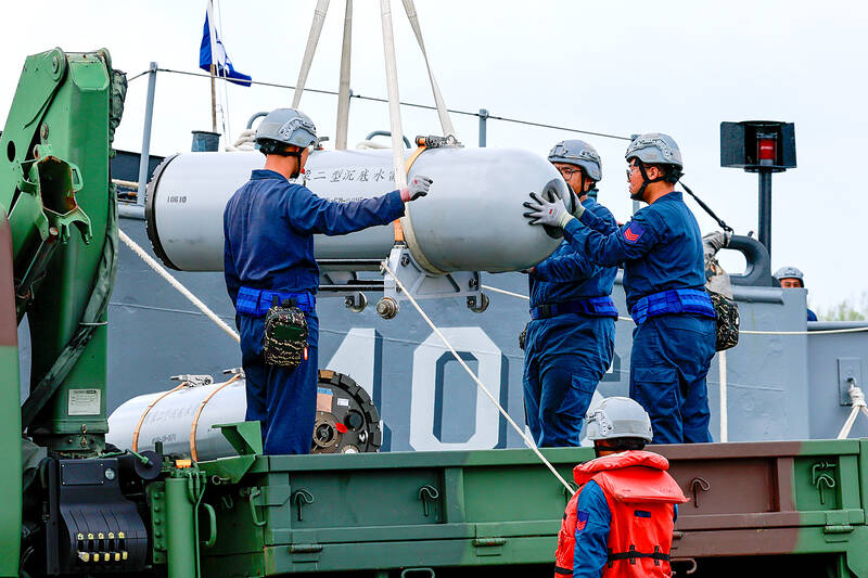 Chang Chia-ming (張家銘), from the navy’s 192nd Fleet’s mine operations squadron, told the president and other officials about the three different types of mines Taiwan uses, all domestically designed and produced.