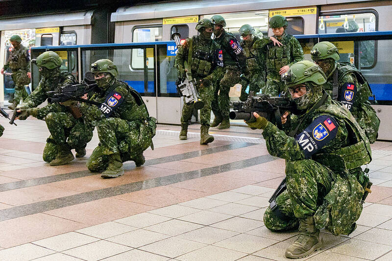 The exercises featured military police carrying Stingers, machine guns, 40mm grenade launchers and anti-armor rockets, and were held between Shandao Temple Station and Longshan Temple Station, while the MRT system was closed to passengers.