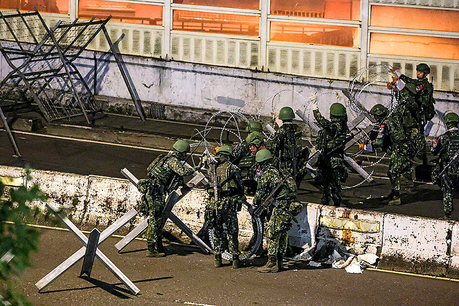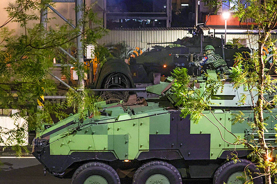In Taipei, the 202nd Military Police Command practiced delaying a simulated PLA advance into the city by blocking and fortifying the Wanban Bridge (萬板大橋) that connects New Taipei City’s Banciao District (板橋) with Taipei’s Wanhua District (萬華), closing the bridge from 11pm on Monday to 6am yesterday.