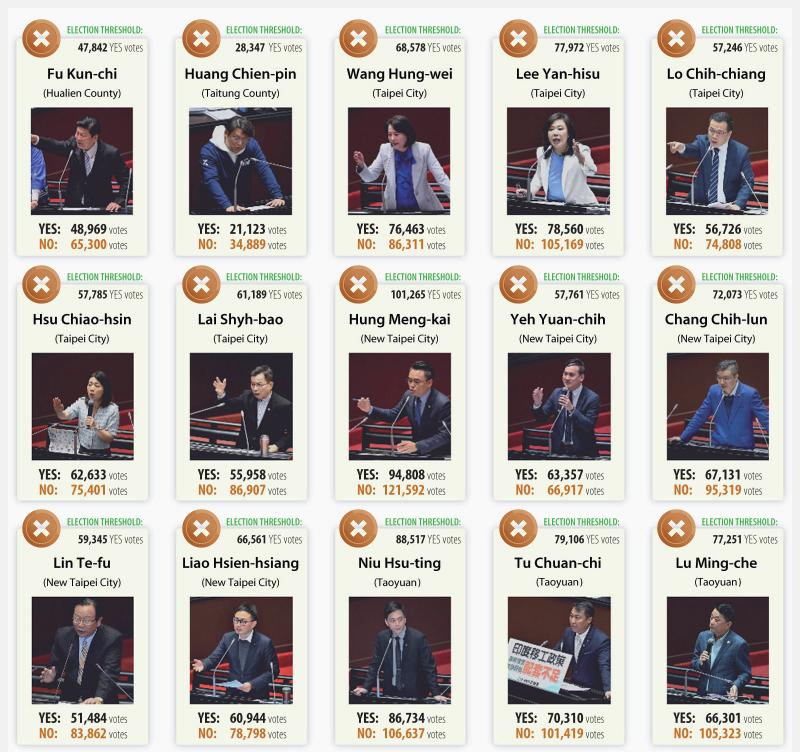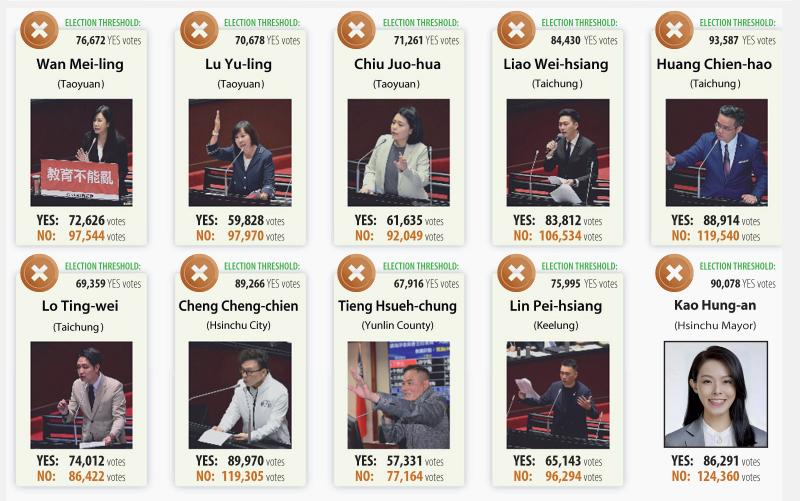 Recall votes against suspended Hsinchu Mayor Ann Kao (高虹安), formerly a member of the TPP, as well as all 24 KMT lawmakers failed to pass, with most losing by sizeable margins, Central Election Commission (CEC) figures showed.