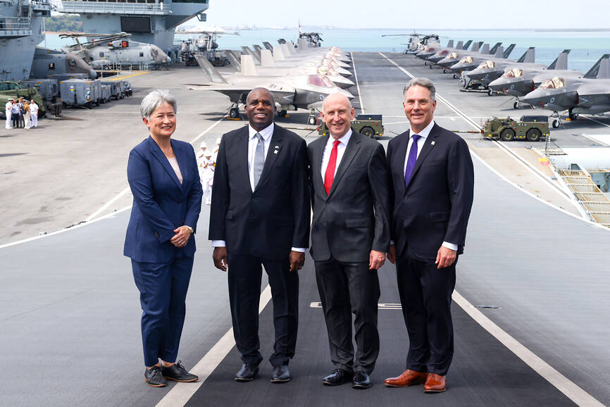 On Friday, following the Australia-UK Ministerial Consultations in Sydney attended by Australian Minister for Foreign Affairs Penny Wong (黃英賢) and Marles, British Secretary of State for Foreign, Commonwealth and Development Affairs David Lammy and Healey, they issued a joint statement saying the ministers “agreed on the critical importance of peace and stability across the Taiwan Strait.”