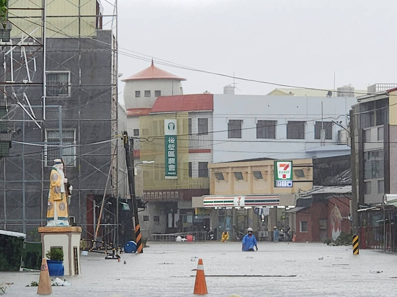 Hsu Hung-po (許宏博), head of the Yunlin County Water Resources Department, said that heavy rain began the previous night, prompting emergency operations at the pumping station in Beigang Township (北港) and the deployment of more than 100 mobile pumps.