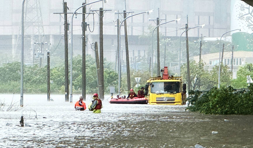 In Puzih City, Chiayi County firefighters rescued five Taiwan Power Co (Taipower, 台電) workers and five residents trapped in vehicles by the flood.