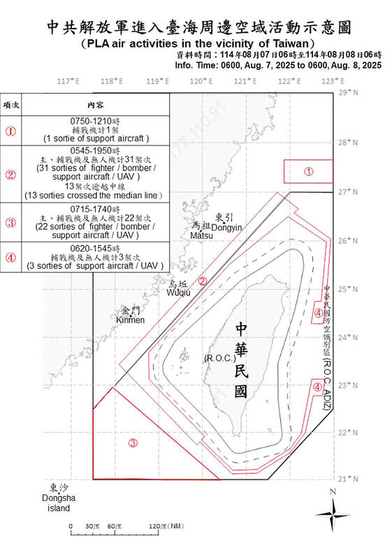 Sixty-three Chinese incursions into waters and airspace around Taiwan were detected in the 24 hours to 6am yesterday, with 38 craft crossing the median line of the Taiwan Strait and entering the nation’s northern, central, southwestern and eastern air defense identification zones, the Ministry of National Defense (MND) said.