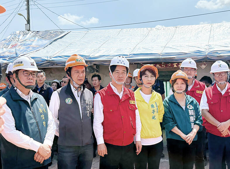 President William Lai (賴清德) yesterday apologized to residents of southern Taiwan over the damage caused by Typhoon Danas and torrential rains that followed in its wake in his fourth visit to the region since the storm struck last month.