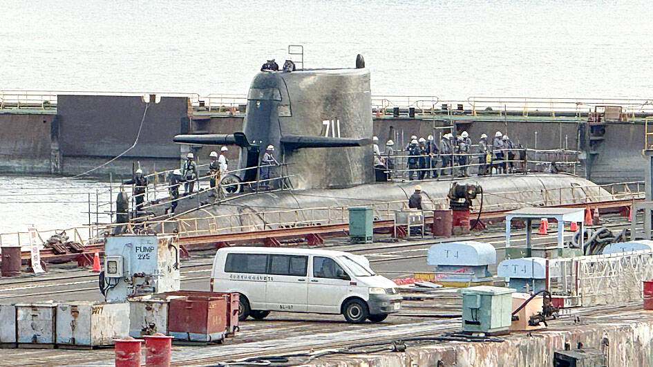 Taiwan’s first indigenous defense submarine on Tuesday was moved out of a dry dock to Pier 91 at Kaohsiung Harbor, with the vessel expected to start preparing to undergo diving tests, although the shipbuilder refused to comment on the matter other than to say that everything was proceeding according to plan.