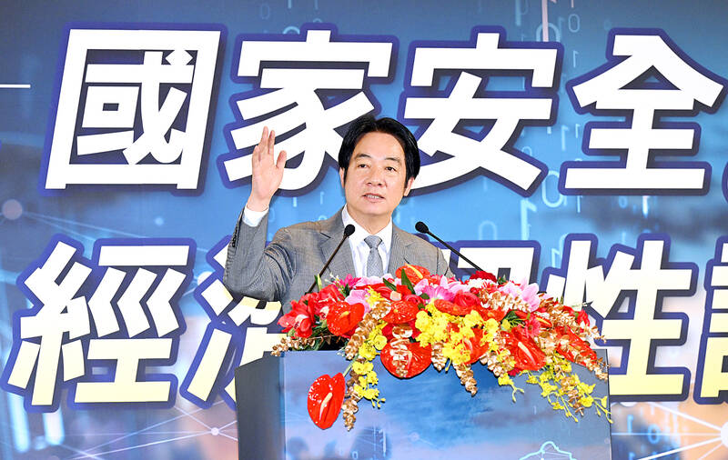 President William Lai (賴清德) yesterday outlined four key aspects of Taiwan’s national security resilience at a forum in Taipei, which was hosted by the Liberty Times (The Taipei Times’ sister newspaper) and co-organized by Chunghwa Telecom Co.