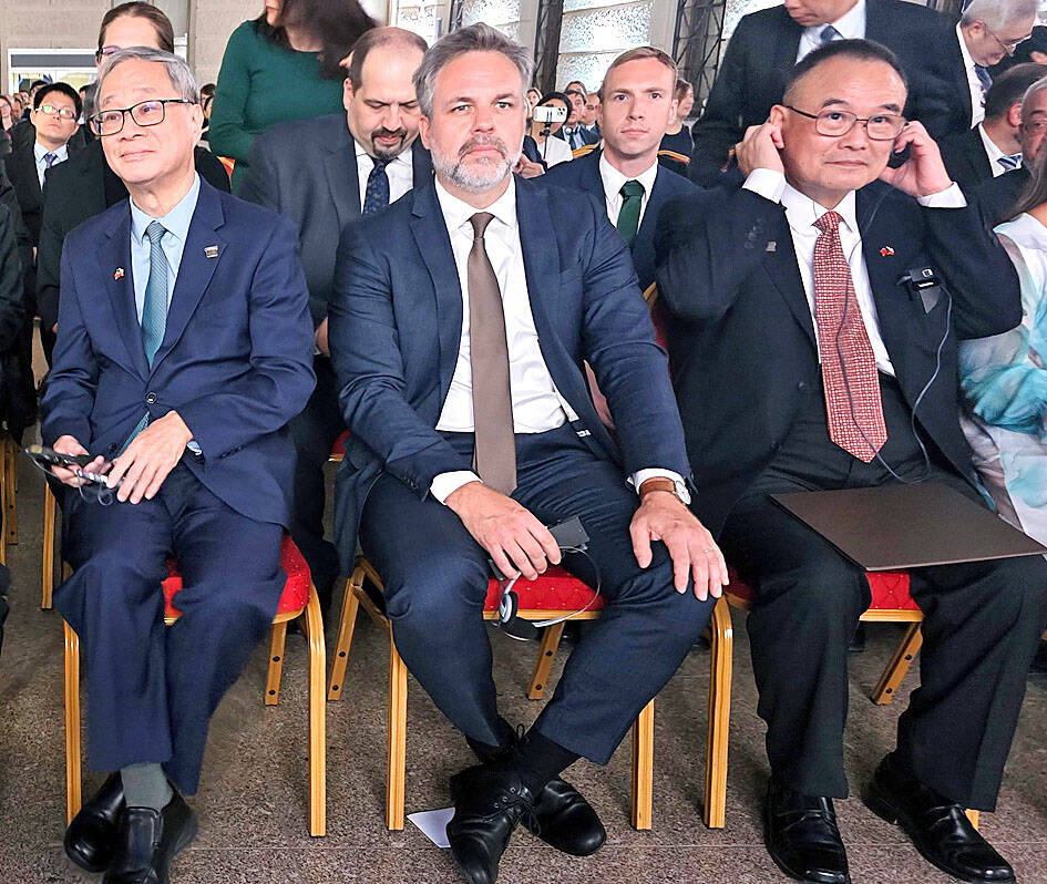 Minister of Foreign Affairs Lin Chia-lung (林佳龍), Minister of Culture Li Yuan (李遠), NPM director Hsiao Tsung-huang (蕭宗煌) and a delegation of lawmakers led by Deputy Legislative Speaker Johnny Chiang (江啟臣) were joined by dignitaries of the Czech Republic, including Czech Chamber of Deputies President Marketa Pekarova Adamova, Czech Senate President Milos Vystrcil, Czech Senate First Vice President Jiri Drahos, Czech Deputy Minister of Culture David Kaspar, Czech Deputy Minister of the Environment Eduard Levy and Czech National Museum director General Michal Lukes at the 100 Treasures, 100 Stories exhibition opening at the Czech Republic’s National Museum.