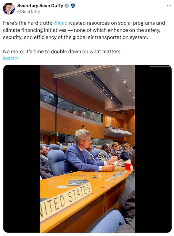 Duffy said that for the sake of global safety, countries that threaten aviation security should be excluded from the ICAO leadership, while all stakeholders, including Taiwan, must be included in its technical work regardless of politics.