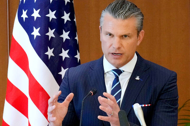 US Secretary of Defense Pete Hegseth yesterday voiced concerns in talks with Chinese Minister of National Defense Dong Jun (董軍) about Beijing’s naval activity around Taiwan and the South China Sea, citing its impact on US security partners in the Indo-Pacific region.