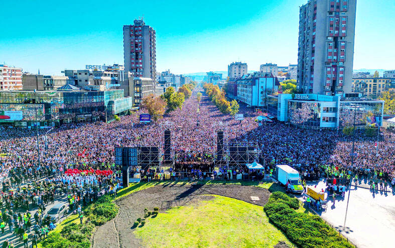 Tens of thousands of protesters yesterday poured into Serbia’s second-largest city a year after a railway station roof collapse that killed 16 people, unleashing discontent over alleged corruption and a lack of accountability many blame for the disaster.