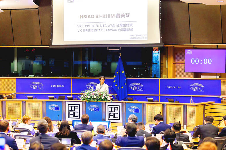Vice President Hsiao Bi-khim (蕭美琴) made history on Friday as the first Taiwanese vice president to deliver a speech in a European parliament while in office, addressing the annual summit of the Inter-Parliamentary Alliance on China (IPAC) in Brussels.