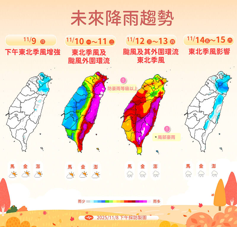 The CWA said it expects eastern Taiwan’s mountainous regions to see an average of 500mm of rain.