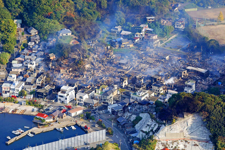 Aerial footage from broadcasters showed houses reduced to rubble and thick plumes of smoke rising from the hilly Saganoseki district of Oita City, which overlooks a fishing harbor renowned for its premium Seki-brand mackerel on the main island of Kyushu.