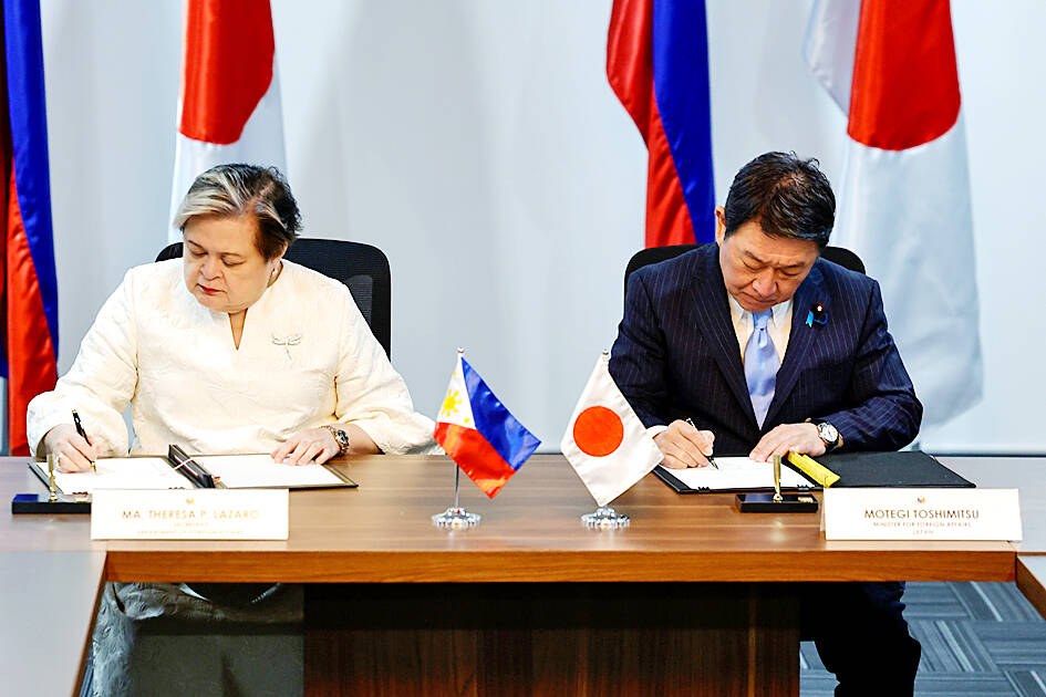 Japan and the Philippines yesterday signed a defense pact that would allow the tax-free provision of ammunition, fuel, food and other necessities when their forces stage joint training to boost deterrence against China’s growing aggression in the region and to bolster their preparation for natural disasters.