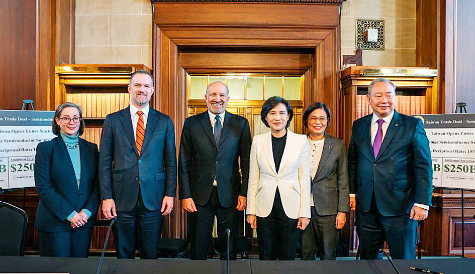 BROAD AGREEMENT: The two are nearing a trade deal to reduce Taiwan’s tariff to 15% and a commitment for TSMC to build five more fabs, a ‘New York Times’ report said Taiwan and the US have reached a broad consensus on a trade deal, the Executive Yuan’s Office of Trade Negotiations said yesterday, after a report said that Washington is set to reduce Taiwan’s tariff rate to 15 percent. The New York Times on Monday reported that the two nations are nearing a trade deal to reduce Taiwan’s tariff rate to 15 percent and commit Taiwan Semiconductor Manufacturing Co (TSMC, 台積電) to building at least five more facilities in the US. “The agreement, which has been under negotiation for months, is being legally scrubbed and could be announced this month,” the paper said,