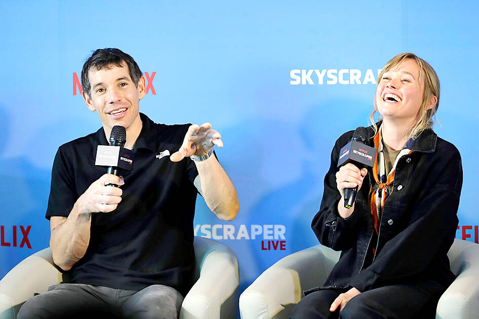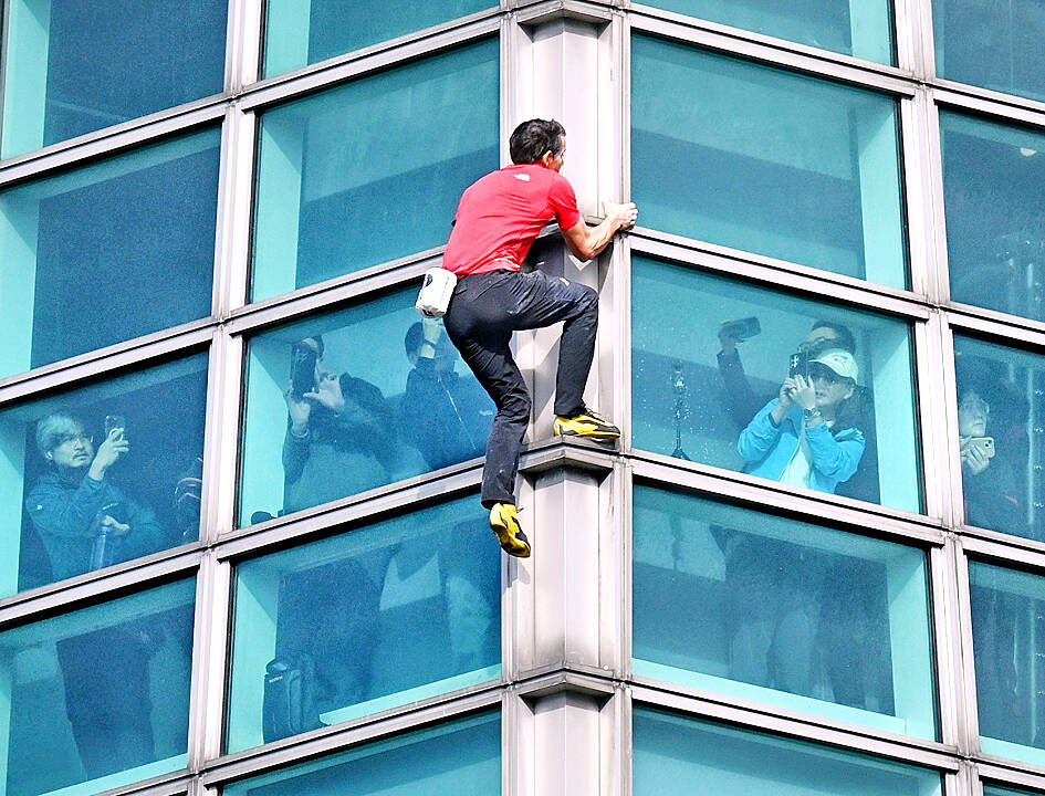 US climber Alex Honnold yesterday took on Taiwan’s tallest building, becoming the first person to scale Taipei 101 without a rope, harness or safety net.